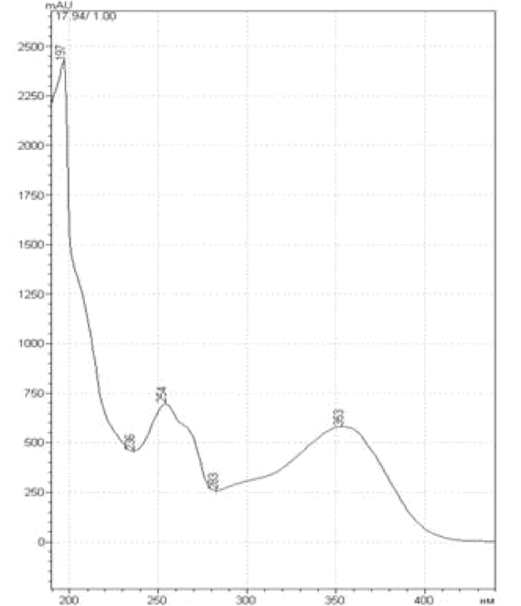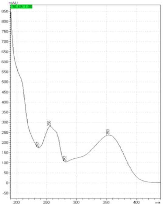 На рисунке 3 показаны хроматограммы В-ПГ экстракта цветков календулы ЗЭФ и рутина. На рисунках 4 и 5 спектр рутина и спектр самого большого пика В-ПГ экстракта с временем удерживания примерно 18 мин. (время выхода пика в верхнем левом углу).