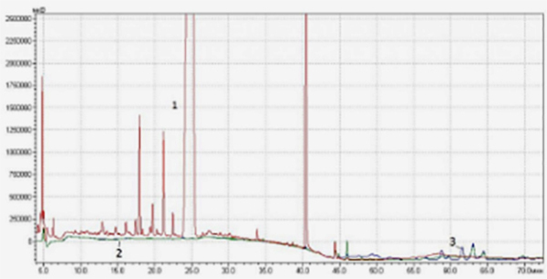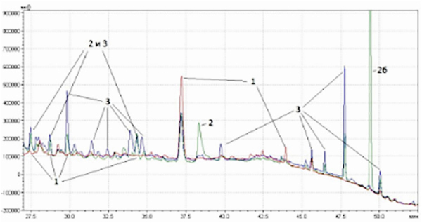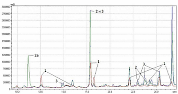 Рис. 3б. Хроматограмма малополярных соединений ромашки (Chamomilla recutita L.) различных производителей: 1 – Symrise (Германия), 2 – 2Д-Фарма (Россия), 3 – «Завод эндокринных ферментов» (Россия).