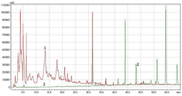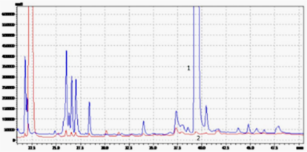 Рис. 4. Хроматограммы воднопропиленгликолевых экстрактов женьшеня различных производителей: 1 – «Завод эндокринных ферментов» (Россия), 2 – Fragrance Oils LTD (Великобритания). Пик 39.5 мин в экстракте 1 – консервант триклозан, пик 22.5 мин в экстракте 2 – консервант метилпарабен.