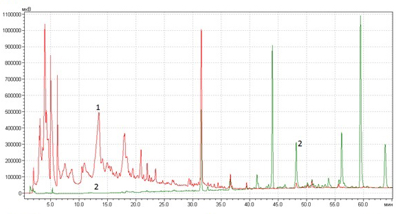 Иногда на хроматограммах обнаруживаются пики веществ, не входящих в состав природных композиций изучаемого экстракта (пик 2а на рис. 3а).