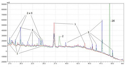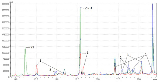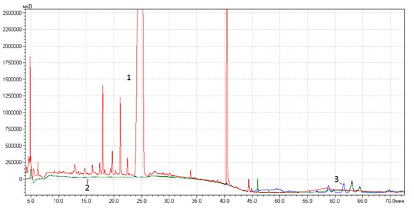 Рис. 3б. Хроматограмма малополярных соединений ромашки (Chamomilla recutita L.) различных производителей: 1 – Symrise (Германия), 2 – 2Д-Фарма (Россия), 3 – Завод эндокринных ферментов (Россия).