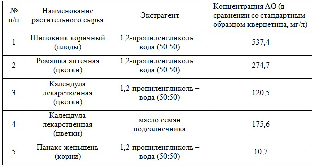 При анализе суммарной концентрации АО в образцах некоторых отечественных экстрактов, производимых для нужд косметической промышленности (Завод эндокринных ферментов, Москва, см. таблицу) было установлено, что экстракты надземных частей растений содержат АО в количестве, равном их содержанию в высококачественных красных виноградных винах [6]. Тот факт, что масляный экстракт календулы лекарственной содержит АО значительно больше, чем воднопропиленгликолевый, объясняется присутствием в исходном подсолнечном масле значительного количества токоферолов и токотриенолов, главным образом, α-токоферола, которые обеспечивают большую часть наблюдаемой антиоксидантной активности масляных экстрактов.