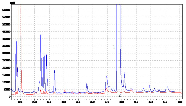 Рис. 4. Хроматограммы воднопропиленгликолевых экстрактов женьшеня различных производителей: 1 –Завод эндокринных ферментов (Россия), 2 – известная британская фирма. Пик 39.5 мин в экстракте 1 – консервант триклозан, пик 22.5 мин в экстракте 2 – консервант метилпарабен.